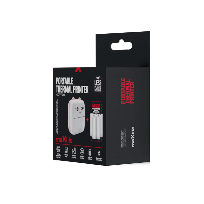 Imprimanta termică Bluetooth Maxlife este o imprimantă portabilă la îndemână, ideală pentru imprimarea unei varietăți de proiecte - de la fotografii la desene, notițe, etichete, autocolante și multe altele. Una dintre caracteristicile sale cheie este imprimarea termică. Vine cu cinci role de hârtie termică, permițându-vă să imprimați fără a schimba cerneala.
