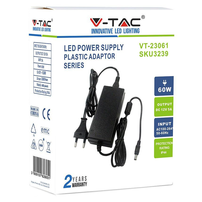 Sursa de alimentare pentru banda LED. Tensiune intrare: 100 - 164 VAC, 50/60 Hz Tensiune iesire: 12 VDC / 5 A Mufa alimentare: 2.1/5.5 tata Putere maxima: 60 W Dimensiuni (mm): 119 x 52 x 32 Greutate: 312 g
