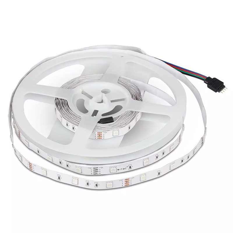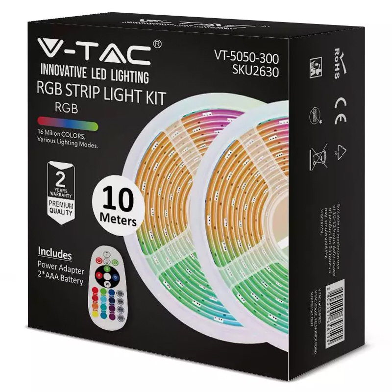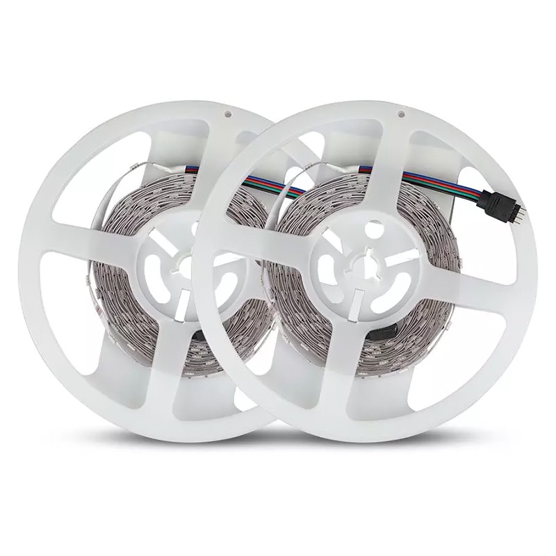 Banda LED RGB, 2 role x 5m, 10mm latime Kit-ul contine: banda LED, alimentator, telecomanda. Flux luminos: 500 lm/m Tensiune alimentare: 12 V Numar de LED-uri/m: 30 led-uri smd, tip 5050 Grad de protectie: IP20 Putere: 4,8 W/m Greutate: 0.64 kg Eticheta de eficiențã energeticã: A++