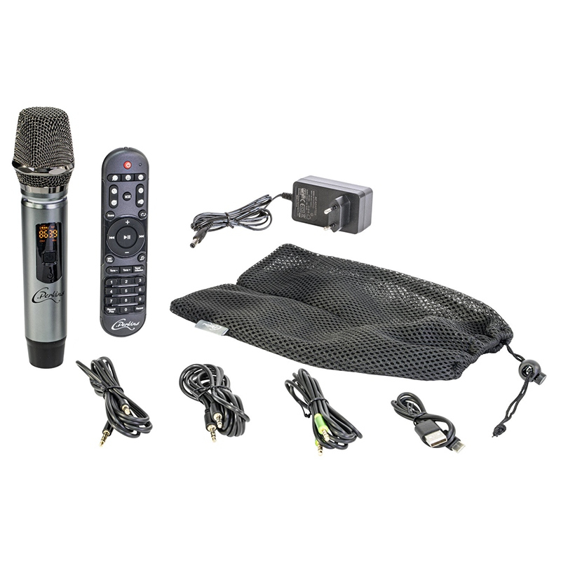 Accesorii furnizate: microfon UHF de mână, cablu de încărcare USB-C pentru a încărca microfonul furnizat, adaptor de rețea pentru a încărca bateria încorporată, portofel de depozitare/protecție pentru microfon, telecomandă, 1x 3.5mm AUX MONO și 2x 3.5mm Cabluri AUX stereo