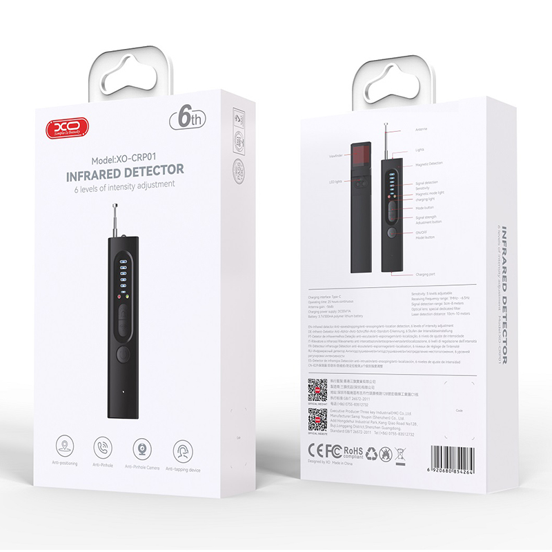 Detector XO IR anti interceptări și detector anti locație CRP01, negru XO CRP01 este un detector pentru detectarea interceptărilor telefonice ascunse, camerelor foto și localizatoarelor GPS. Capacitate baterie: 300 mA