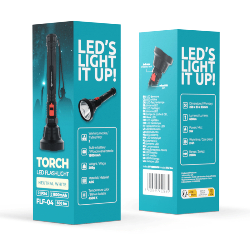 FLF-04 TORCH este o lanternă cu rază lungă de acțiune, potrivită pentru orice casă sau garaj. Mânerul lung și cureaua de mână sunt perfecte în cazul întreruperilor de curent sau patrulare. Această lanternă funcțională va fi de mare ajutor în situații de urgență. Cureaua de mână inclusă vă permite să agățați lanterna de încheietura mâinii, astfel încât să vă puteți folosi mâinile liber și să evitați să scăpați lanterna.