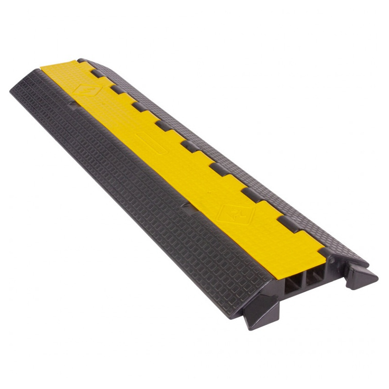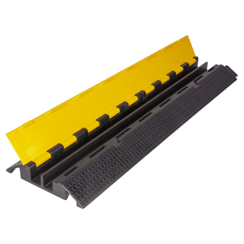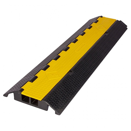 Rampă de cablu profesional, rezistent, cu o separare între canale și prevăzut cu un capac galben pentru a îmbunătăți vizibilitatea pe podea.