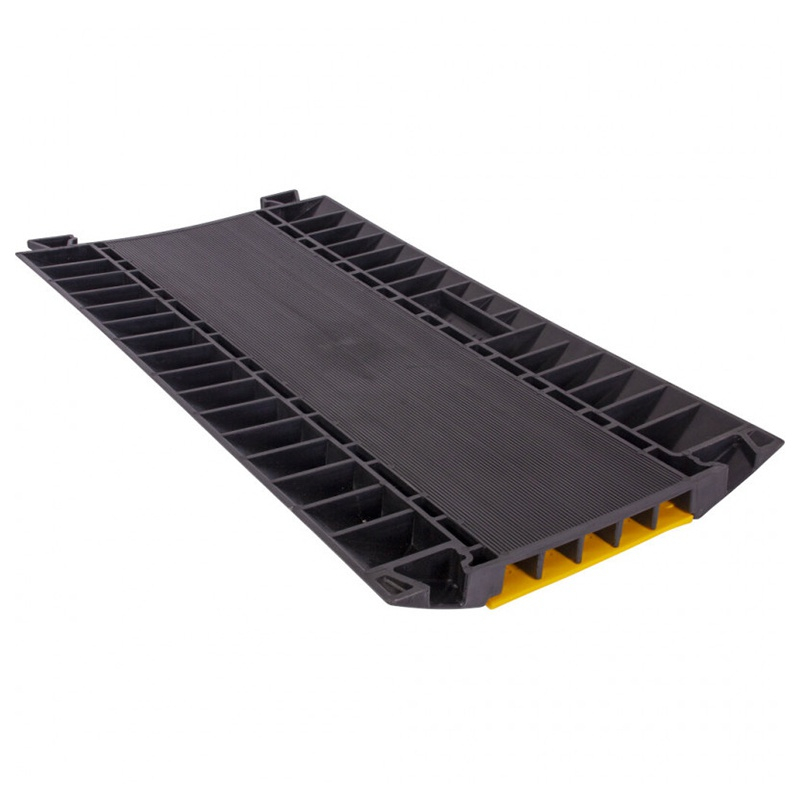 Rampă de cablu profesional, rezistent, cu o separare între canale și prevăzut cu un capac galben pentru a îmbunătăți vizibilitatea pe podea.