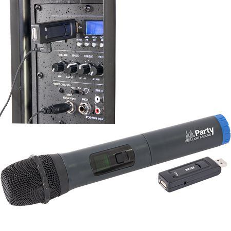 Microfon UHF de ultima generatie. Receptorul este alimentat din portul USB si este conectat la intrarea echipamentului audio printr-un cablu cu mafa jack (adaptor jack 3.5 mm / 6.3 mm inclus).