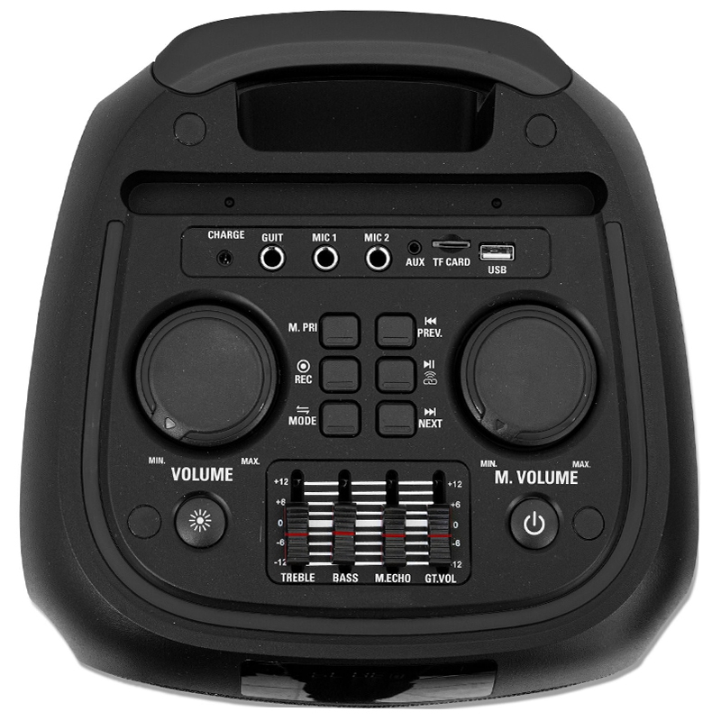 Boxă portabilă, alimentată cu baterie, cu difuzoare iluminate cu LED pentru a vă îmbunătăți serile Karaoke acasă sau în deplasare. Doar conectați microfonul inclus și petrecerea poate avea loc până târziu în noapte.