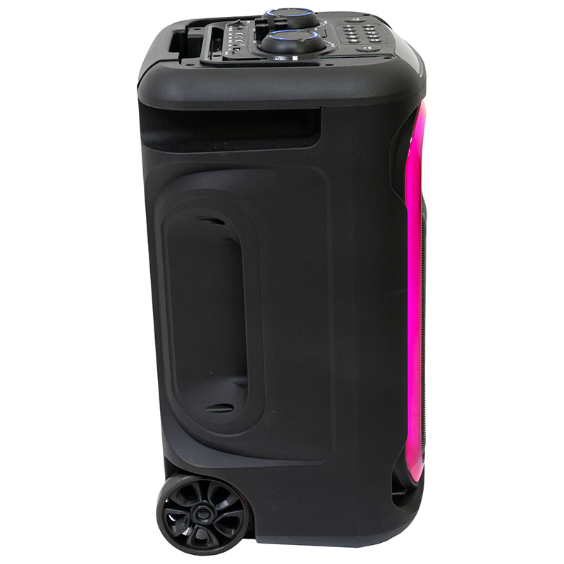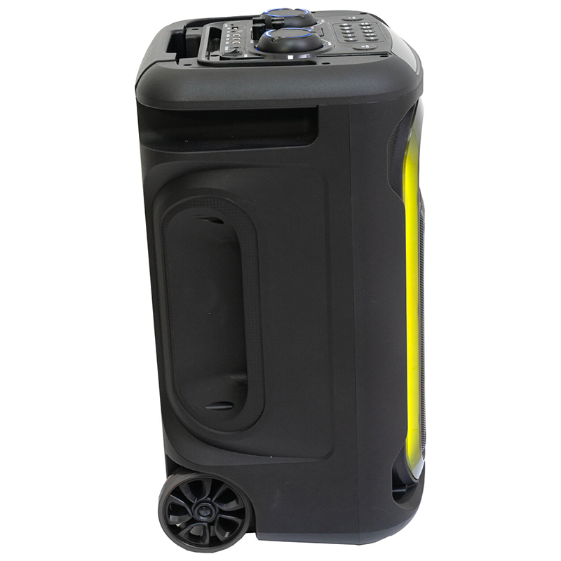 Acest difuzor mobil, prevăzut cu roți și un cărucior, este alimentat de o baterie reîncărcabilă încorporată și are un joc de lumini în față pentru a crea o atmosferă de petrecere oriunde te-ai afla.