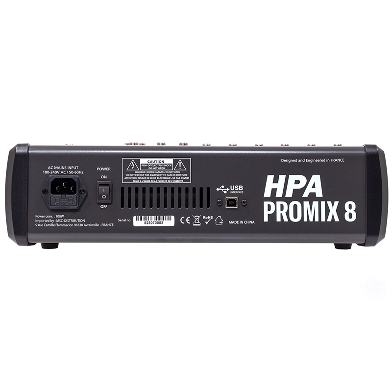 În ceea ce privește conectivitatea, HPA Promix 8R are ieșiri principale echilibrate și neechilibrate (XLR), precum și ieșiri auxiliare și de efecte (mufă de 6,35 mm).