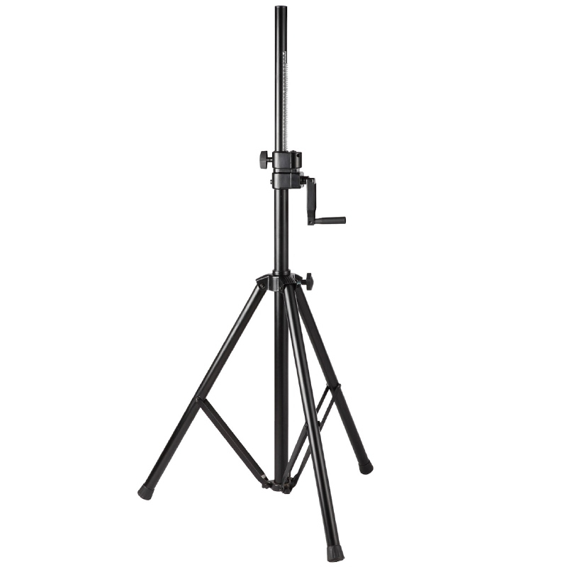 Trepied ranforsat din otel negru care prezinta un mecanism cu cremaliera si pinion cu sistem de blocare de siguranta care impiedica alunecarea tubului.